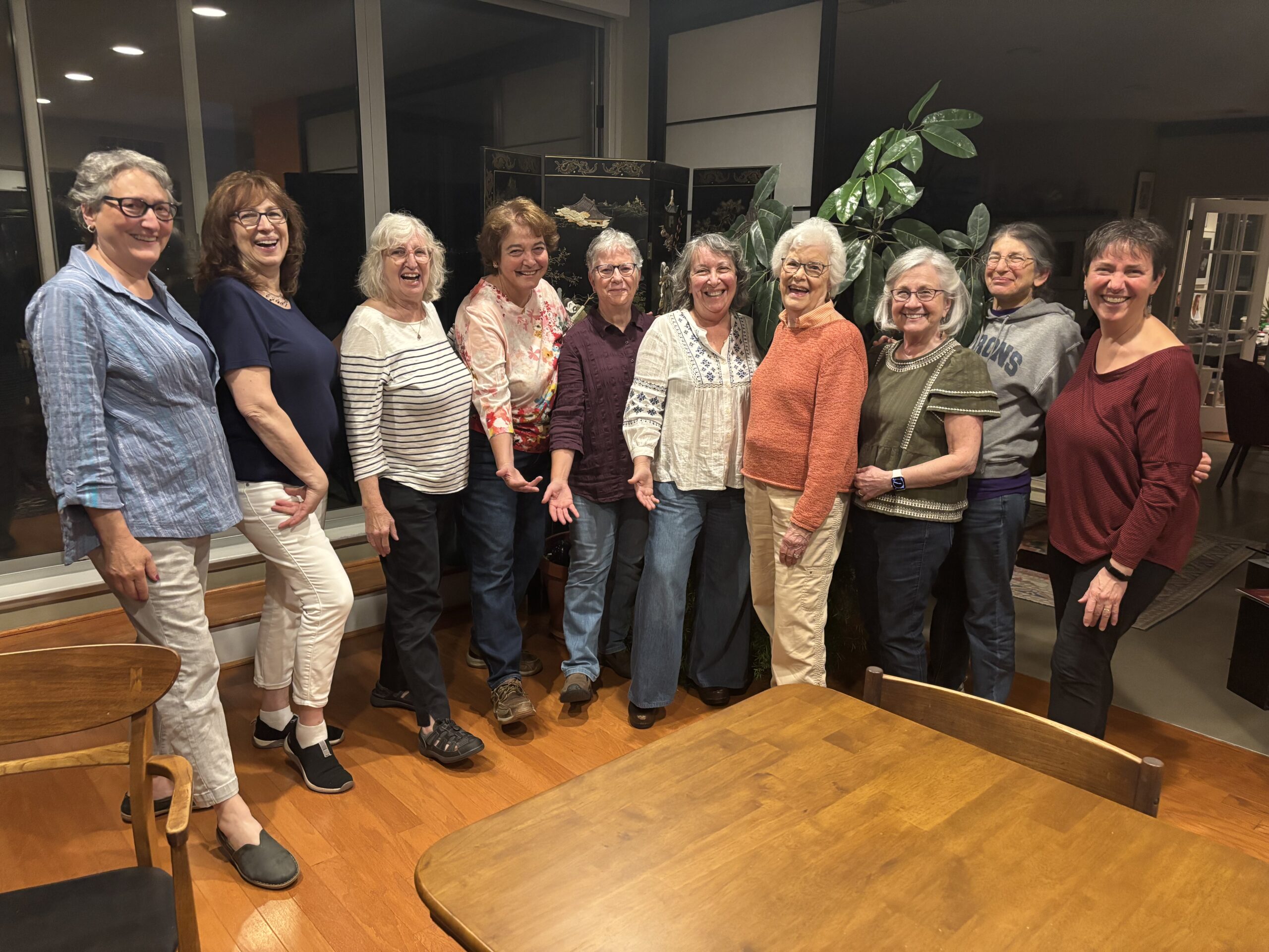 We meet monthly, alternating between Zoom meetings at 6 p.m. and in-person gatherings, either in our homes or at a restaurant, at 6:30 p.m. Meetings are usually the fourth Monday of each month.